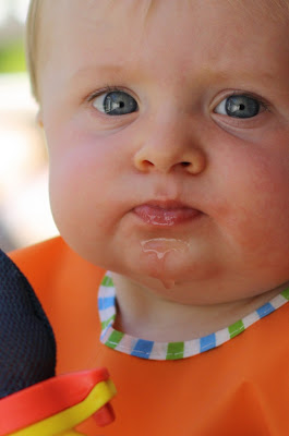 So after three stained outfits earlier in the season, I've learned my lesson. James wears only a diaper and a waterproof bib when he eats watermelon. And he always has to be outside, because there is a puddle of watermelon juice under him when he's done.